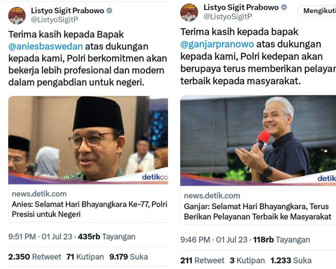 Jakarta – Kapolri Listyo Sigiti Prabowo mengunggah ucapan HUT Bhayangkara ke-77 oleh dua bakal calon presiden, Ganjar Pranowo dan Anies Baswedan. Reaksi netizen yang men-share ataupun me-like postingan tersebut mencuri perhatian.